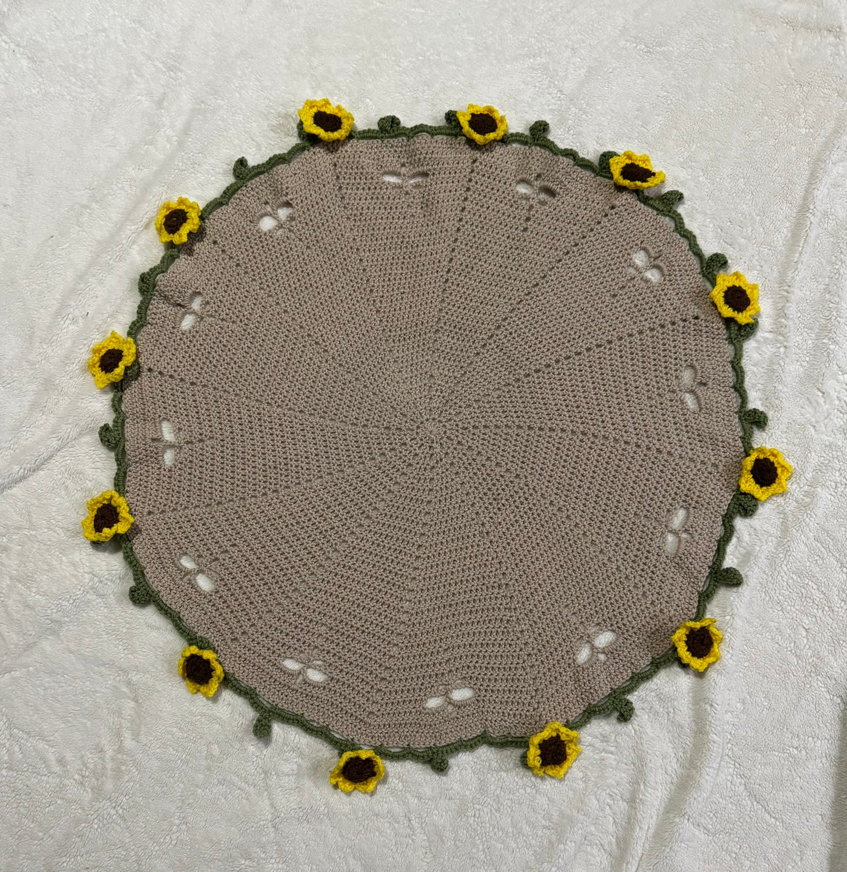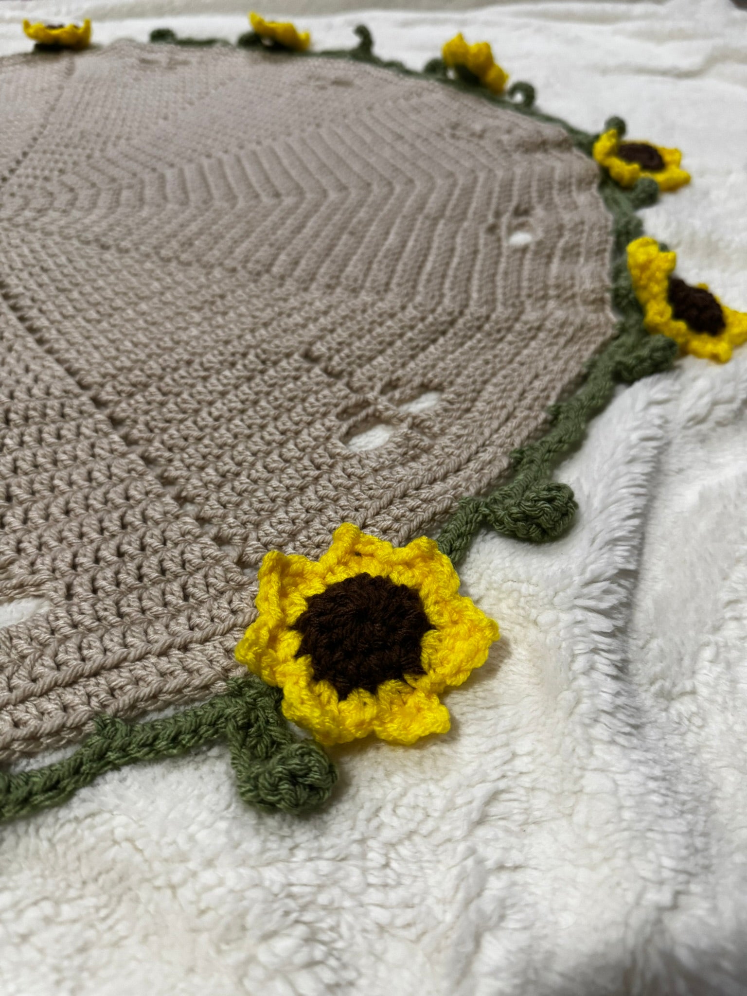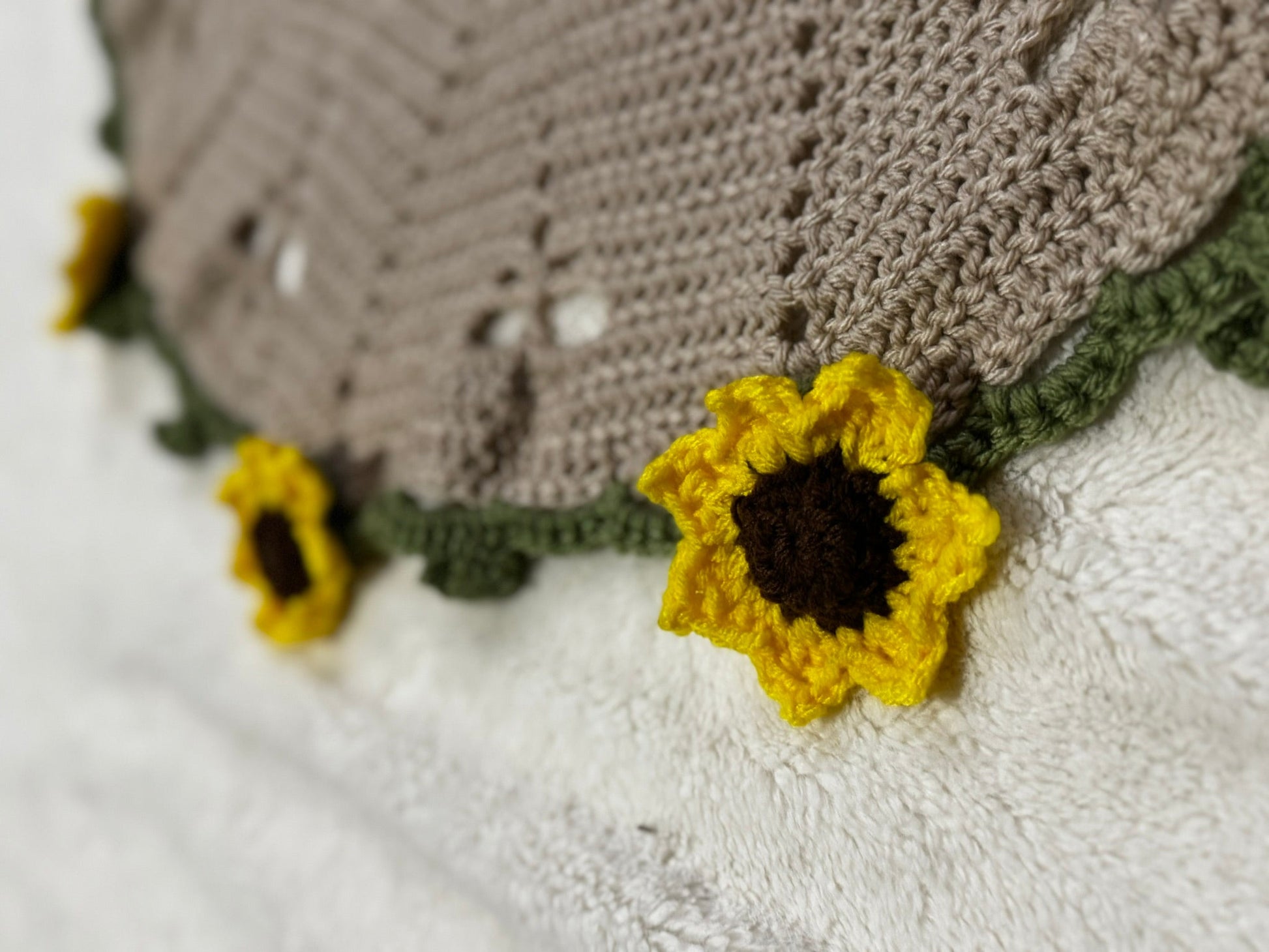 This piece is made with cozy yarn, tightly woven for minimal spacing, and is beautifully variegated. Each sunflower is hand stitched and secured to the blanket, pull tested.