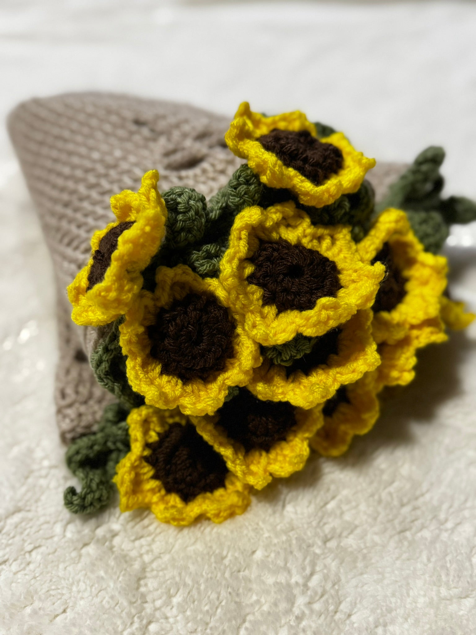 Get cozy with our crochet sunflower bouquet blanket! Perfect for snuggling up with on chilly nights, this quirky and fun blanket features a unique crochet sunflower design. Add a touch of playful charm to your home décor and stay warm at the same time.