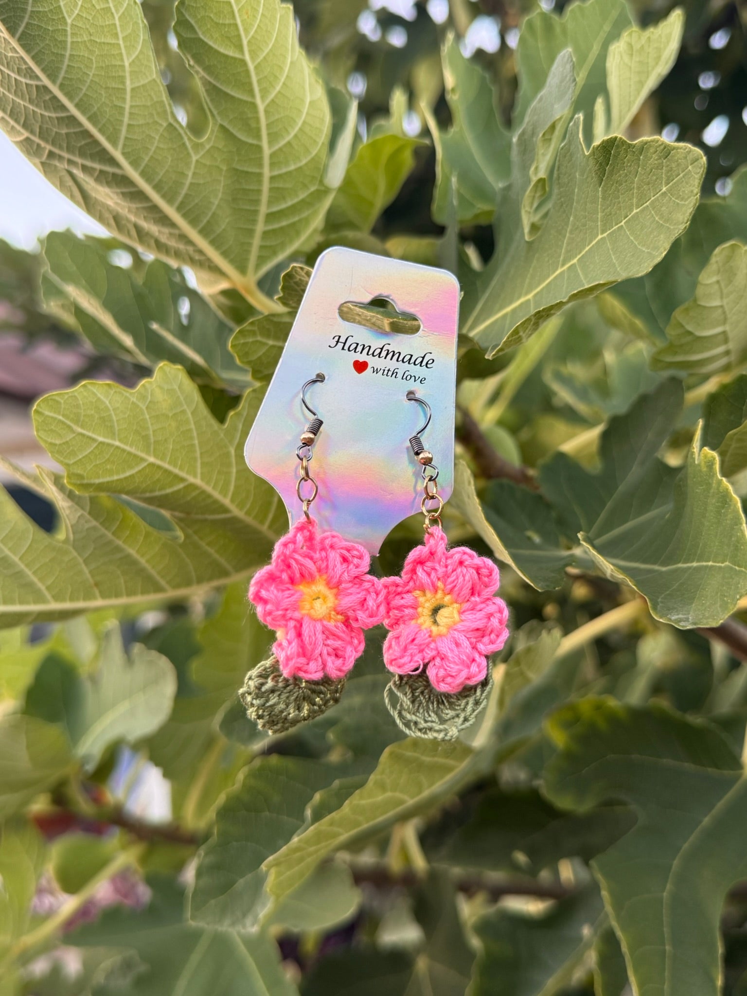 Add a pop of playful charm to your look with these pink flower dangle earrings. Handcrafted with delicate crochet, each petal brings a touch of whimsy and softness. Lightweight and easy to wear, they're perfect for brightening any outfit with a splash of handmade fun.