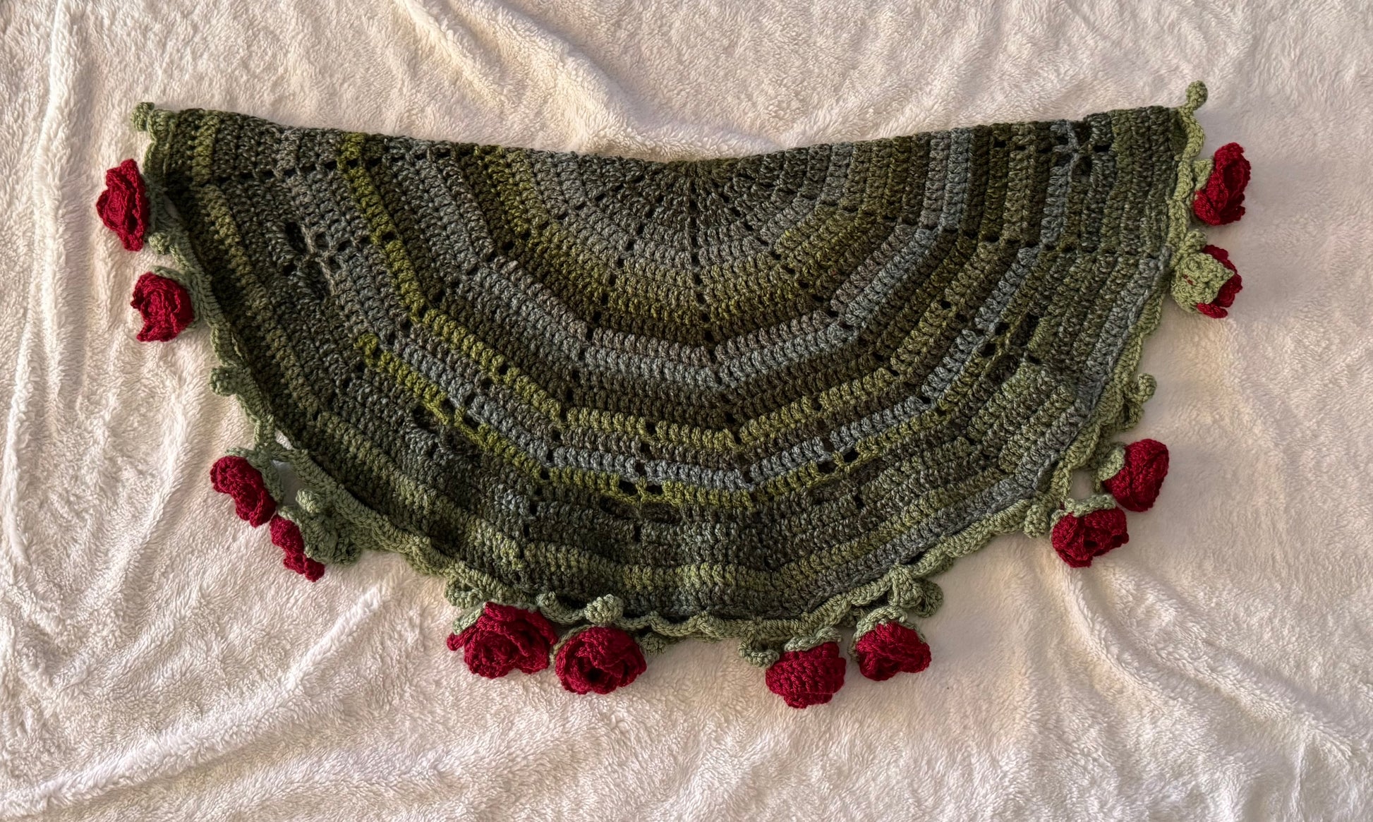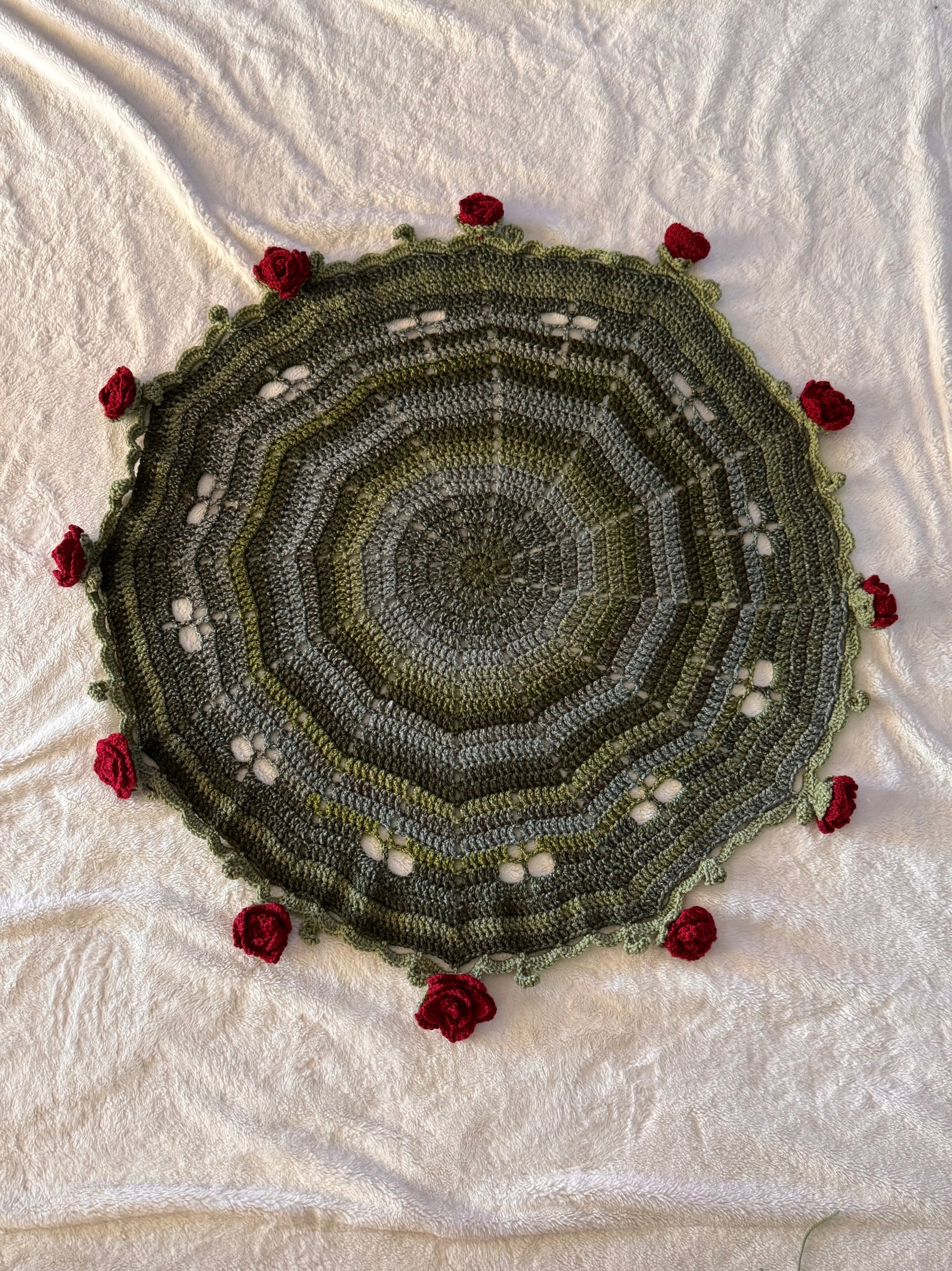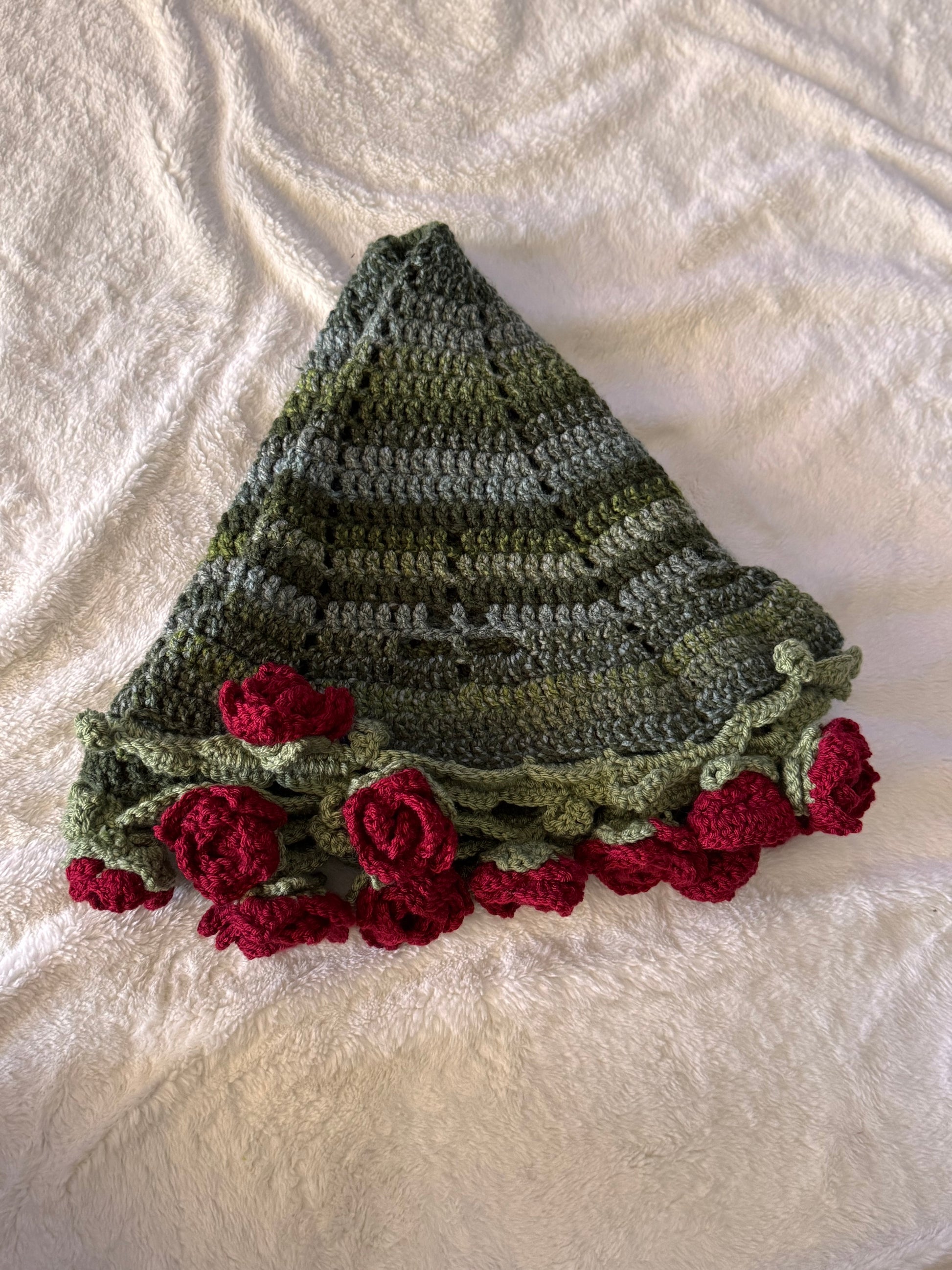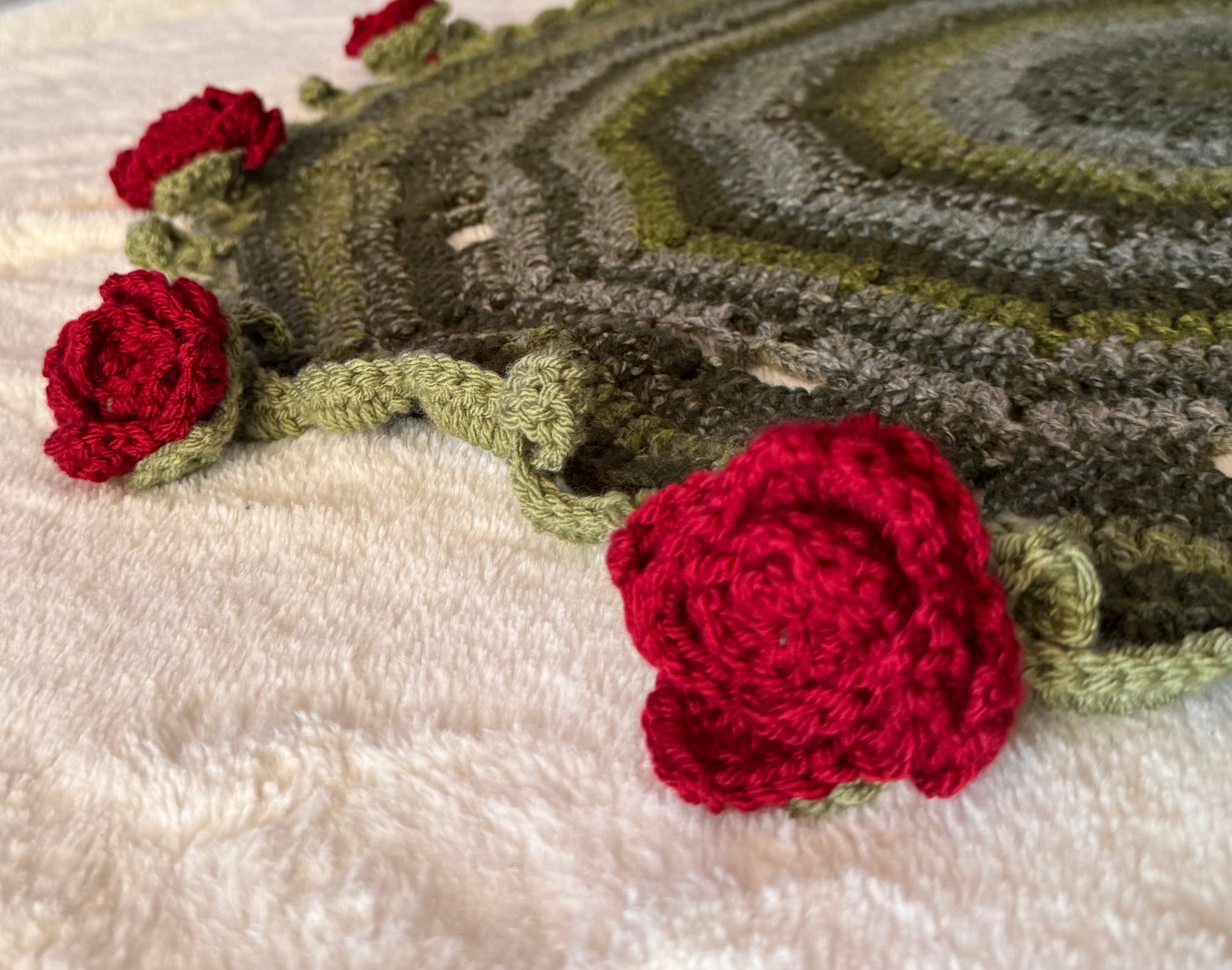 This piece is made with cozy yarn, tightly woven for minimal spacing, and is beautifully variegated. Each rose is hand stitched and secured to the blanket, pull tested.
